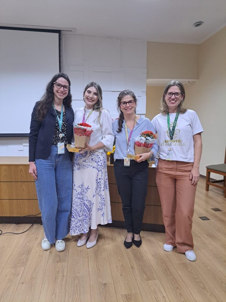 A abertura do evento foi realizada com a participação da Supervisora e Responsável Técnica do BLH, Paula Torres Presti; Simone Manso de Carvalho, médica do BLH; Marina Nogueira Berbel Bufará, Gerente Técnica de Nutrição e Dietética e Cláudio Lucas Miranda, diretor do Departamento de Apoio e Assistência do HCFMB.