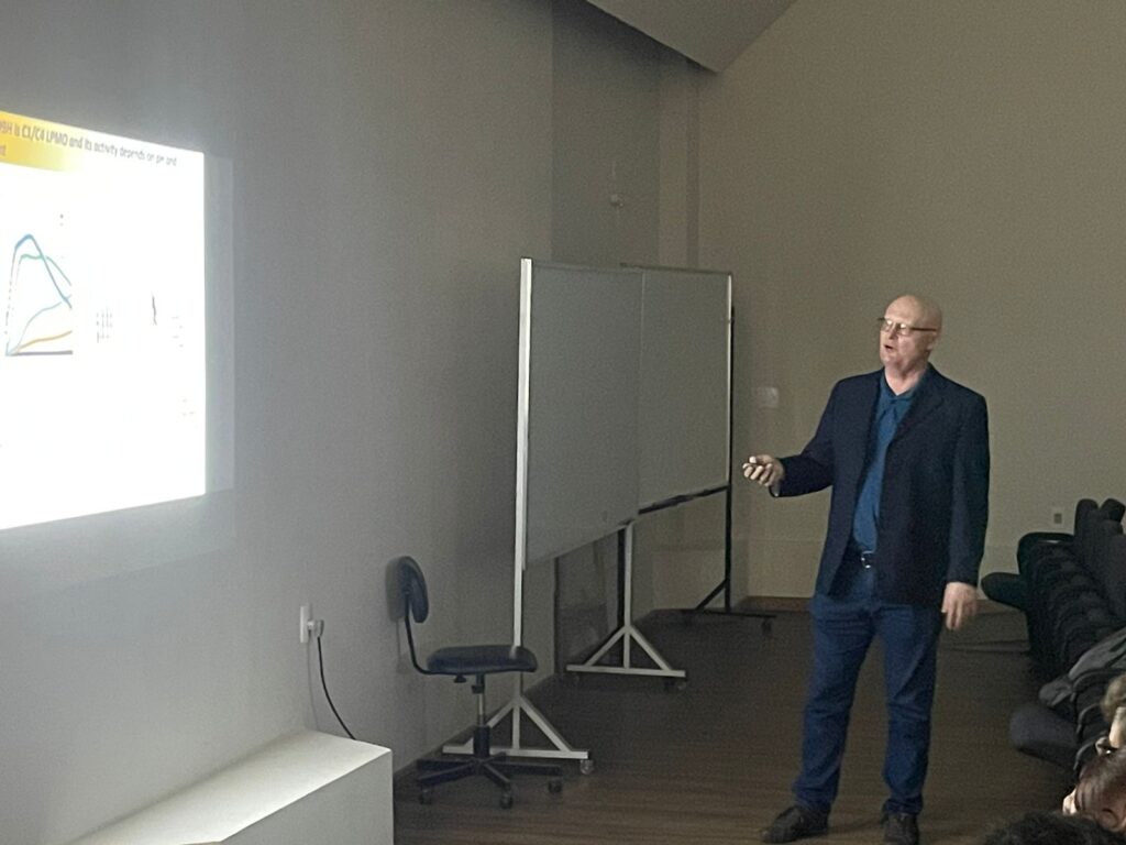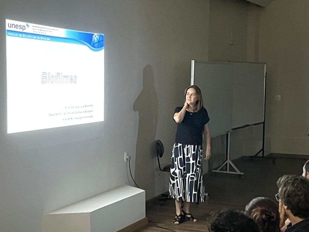 As discussões sobre os diferentes organismos produtores de biofilmes foram conduzidas pelos professores do IBB Rodrigo Ravanelli e Vera Lúcia Mores Rall e o Professor Titular do Instituto de Física de São Carlos da USP, Dr. Igor Polikarpov, relatou as ações das cazymes (enzimas ativas de Carboidratos) contra microorganismos.