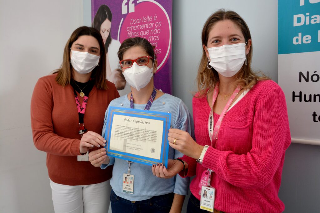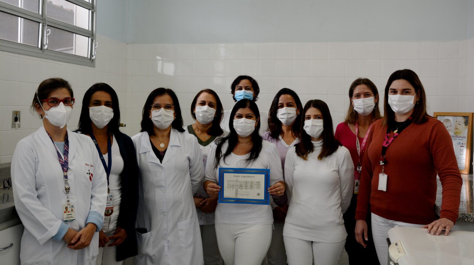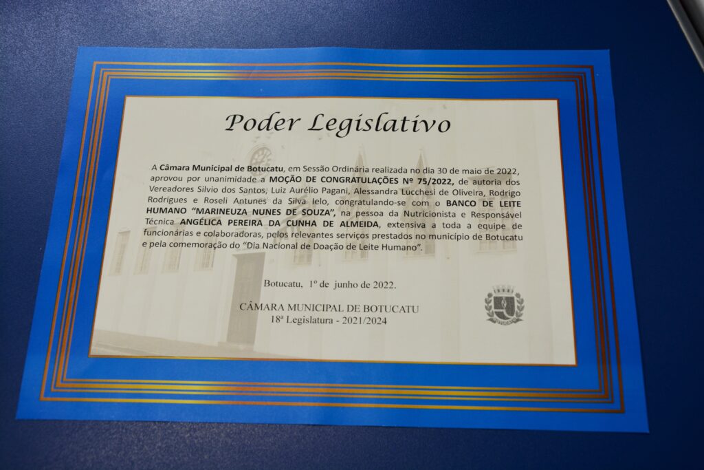 Neste mês de junho, o Banco de Leite Humano (BLH) do Hospital das Clínicas da Faculdade de Medicina de Botucatu (HCFMB) recebeu uma Moção de Congratulações da Câmara Municipal de Botucatu. A honraria é destinada a toda a equipe de funcionárias e colaboradoras pelos relevantes serviços prestados no município de Botucatu e pela comemoração do “Dia Nacional de Doação de Leite Humano”, no dia 19 de maio.