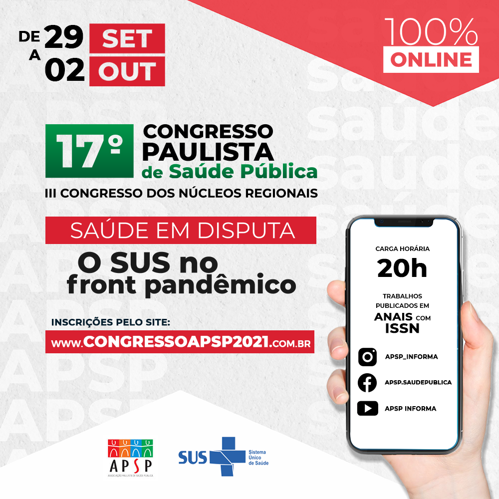 Entre os dias 29 de setembro e 2 de outubro, acontece a 17ª edição do Congresso Paulista de Saúde Pública tendo, como tema, “Saúde em disputa: o SUS no front pandêmico”, com o objetivo de analisar e reconhecer os desafios que estão sendo postos para a sustentação do Sistema Único de Saúde (SUS).