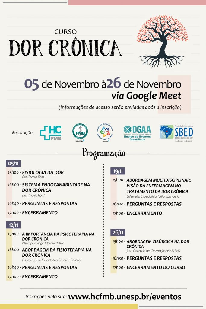 A Superintendência do HCFMB, através da Residência Multiprofissional da Saúde do Adulto e Idoso e do Núcleo de Eventos Científicos do Departamento de Gestão de Atividades Acadêmicas (DGAA), convida para participar do Curso sobre Dor Crônica, que será realizado, de forma online, nos dias 5, 12, 19 e 26 de novembro, a partir das 15h, pela plataforma Google Meet (as informações de acesso serão enviadas após a confirmação da inscrição).