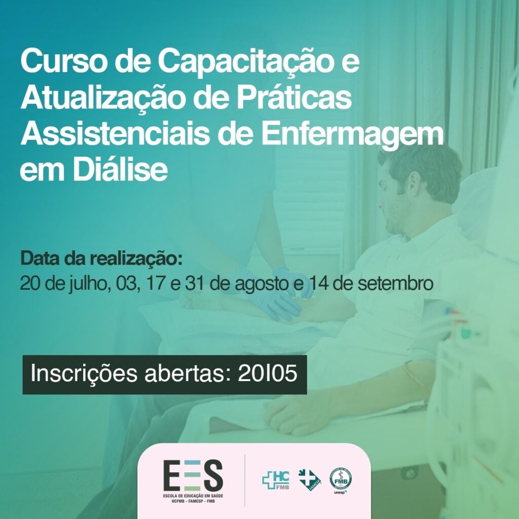 A Escola de Educação em Saúde do HCFMB, realiza nos meses de julho, agosto e setembro, o Curso de Capacitação e Atualização de Práticas Assistenciais de Enfermagem em Diálise. Com inscrições abertas, o curso é voltado para diferentes profissionais da área da saúde, entre eles: enfermeiros(a), médicos(a), técnicos(as), alunos de graduação e pós-graduação, seja do ensino público ou privado.