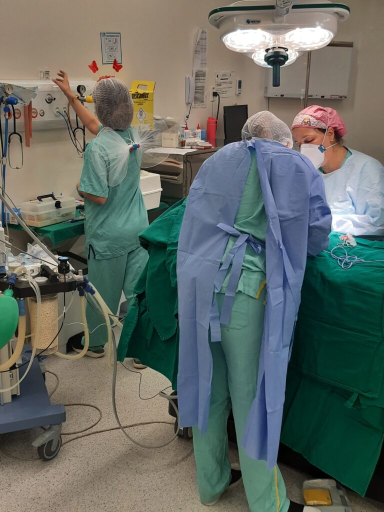 A montagem e desmontagem da sala cirúrgica têm aproximadamente 15 minutos, não gerando atraso na programação cirúrgica da sala a seguir. O material é limpo e esterilizado entre cada procedimento. Todo equipamento que fica em contato com a criança, como, por exemplo, o capacete, é de uso individual e permanece com a criança para a alta.
