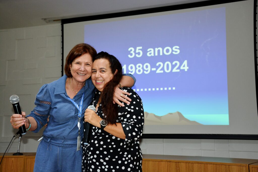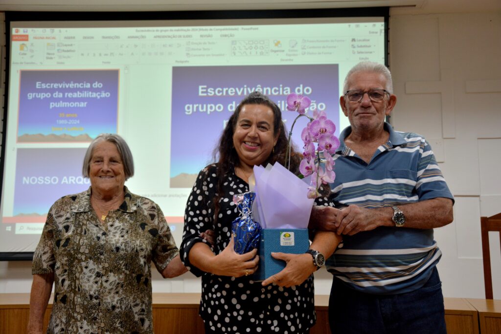 A história e as “escrevivências” dos 35 anos da Reabilitação Pulmonar foram contadas a partir de uma apresentação de fotos, conduzida por Irma de Godoy e pela coordenadora do Núcleo de Reabilitação, Letícia Cláudia de Oliveira Antunes.