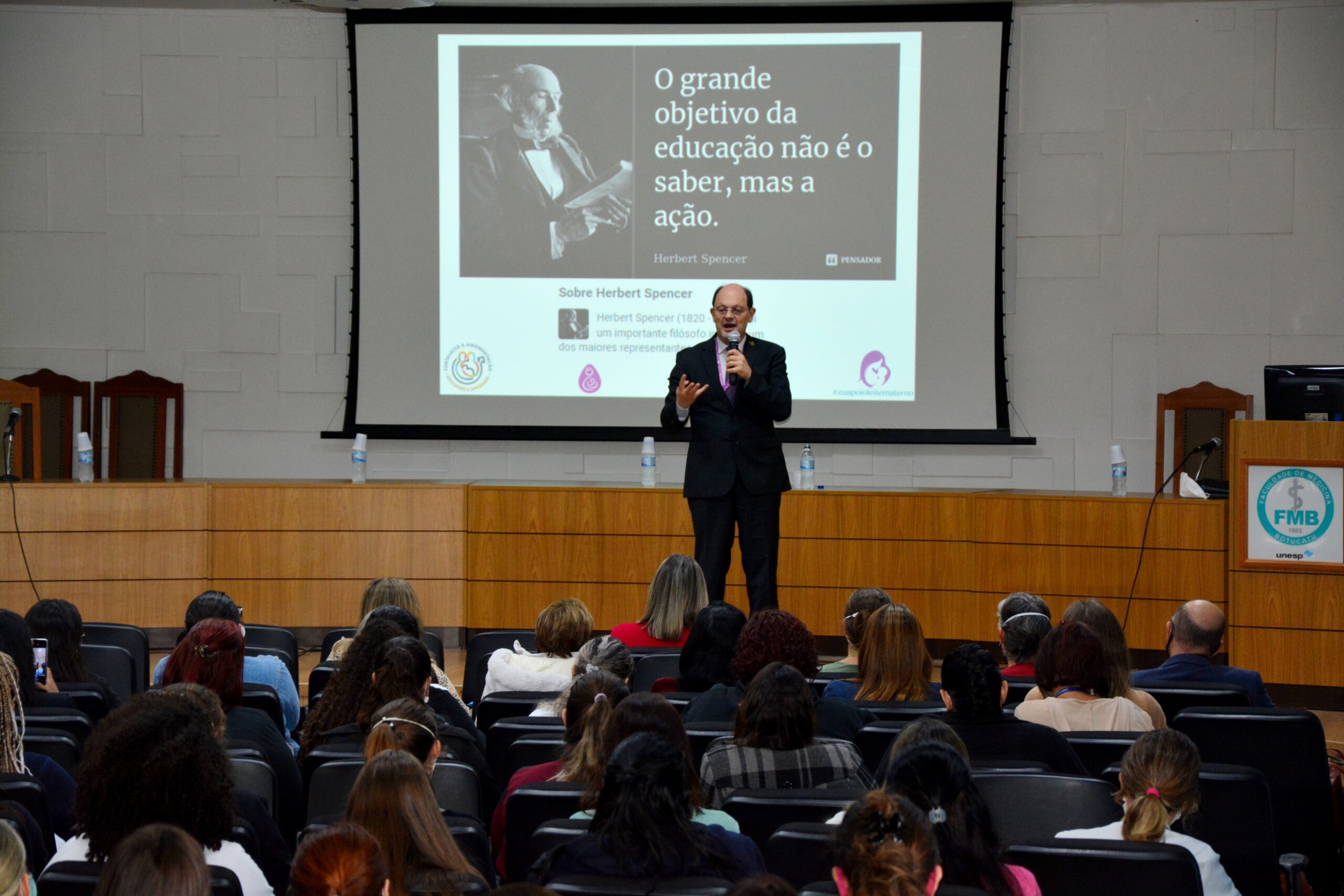O Salão Nobre da Faculdade de Medicina de Botucatu (FMB) recebeu, na tarde da última quinta-feira, 18, alunos, residentes e profissionais de Saúde para o evento de Sensibilização ao Aleitamento Materno, promovido pelo Banco de Leite Humano (BLH) – Gerência Técnica de Nutrição e Dietética e pelo Núcleo de Eventos Científicos do Departamento de Gestão de Atividades Acadêmicas do Hospital das Clínicas da Faculdade de Medicina de Botucatu (HCFMB).