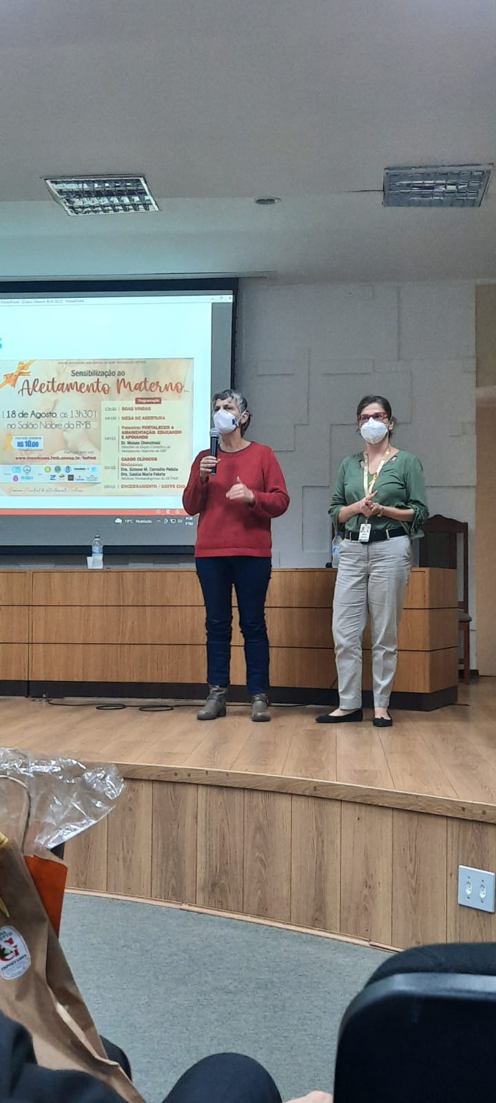 Na mesa de abertura do evento, estiveram presentes a Gerente Médica do HCFMB, Dr.ª Giovana Tuccille Comes; Dr. João Cesar Lyra, médico do Serviço de Neonatologia; Dr.ª Simone Manso de Carvalho Pelícia, médica do BLH; a Gerente Técnica de Nutrição e Dietética do HCFMB, Marina Nogueira Berbel Bufarah e a nutricionista responsável pelo BLH, Angélica Almeida.