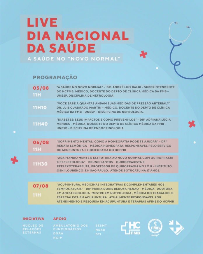 Para marcar o Dia Nacional da Saúde, comemorado no dia 5 de agosto, o Hospital das Clínicas da Faculdade de Medicina de Botucatu (HCFMB) realizará, na próxima semana, uma série de lives com especialistas das mais diferentes especialidades que terão como tema central “A saúde no novo normal”.