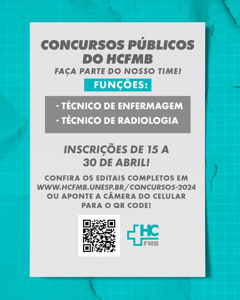 As inscrições podem ser realizadas a partir desta segunda-feira, 15 de abril, até às 23h59 do dia 30 de abril, pelo site http://www.hcfmb.unesp.br/concursos-2024, em que estão disponíveis os editais completos dos cargos. A taxa de inscrição é de R$ 77,79 para os dois editais.