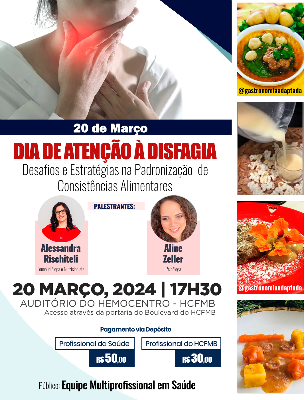 A Superintendência do HCFMB, através do Serviço de Fonoaudiologia e do Núcleo de Eventos Científicos do Departamento de Gestão de Atividades Acadêmicas (DGAA), convidam os profissionais de Saúde para o evento Desafios e Estratégias na Padronização de Consistências Alimentares – Dia de Atenção à Disfagia, que será realizado no dia 20 de março, a partir das 17h30, no Auditório do Hemocentro do HCFMB.