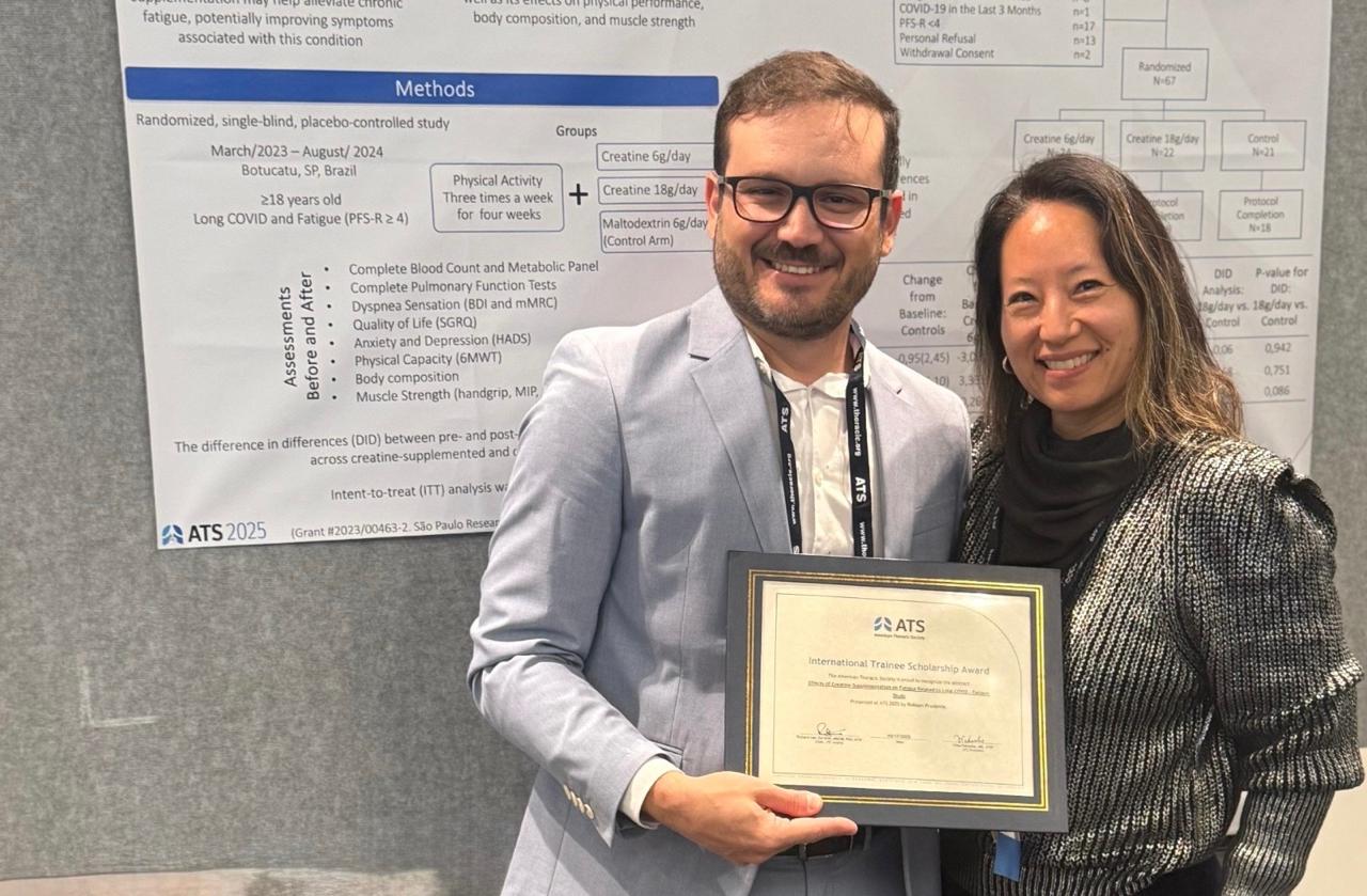 Na ocasião, o trabalho apresentado pela delegação do HCFMB foi premiado como um dos melhores projetos internacionais. Denominado Effects of Creatine Supplementation on Fatigue Related to Long COVID – Fatigue Study (Efeitos da suplementação de creatina na fadiga relacionada à covid longa – Estudo Fatigue), o estudo teve o objetivo de avaliar a eficácia da suplementação de creatina no alívio dos sintomas de fadiga em pacientes com COVID longa, bem como seus efeitos no desempenho físico, composição corporal e força muscular.