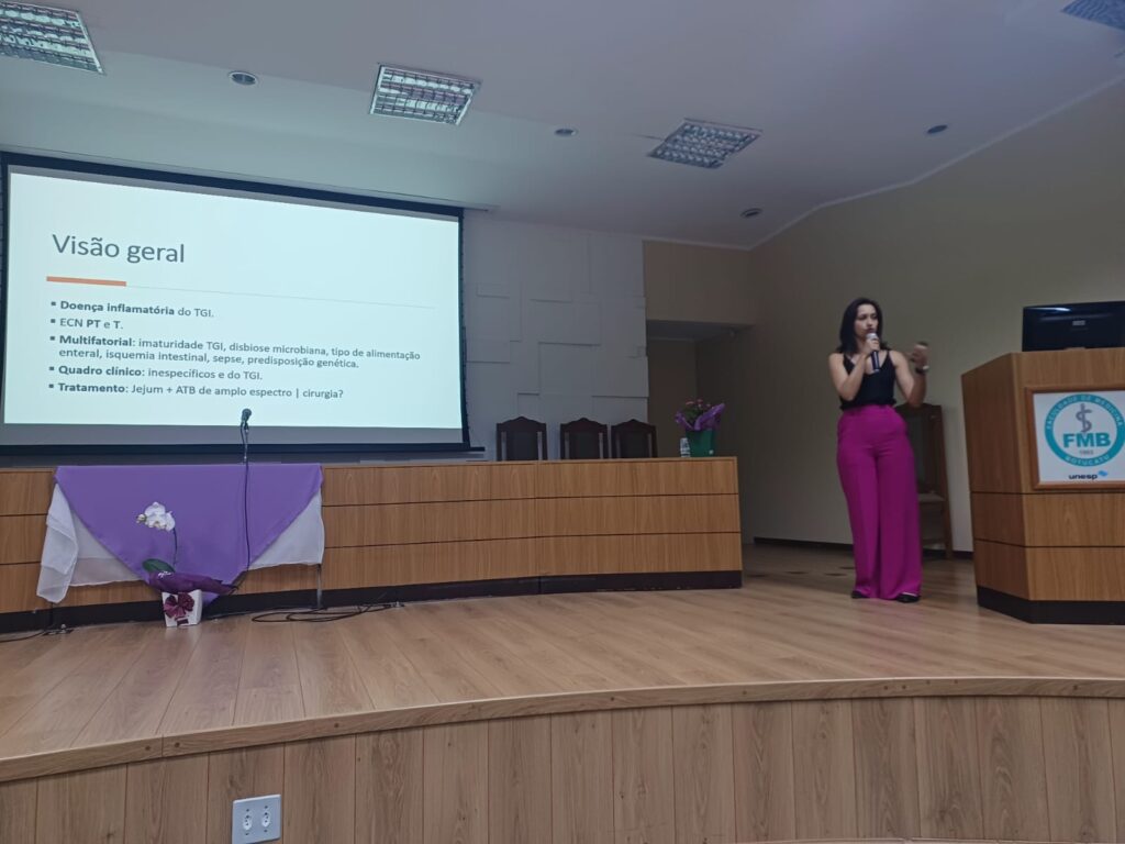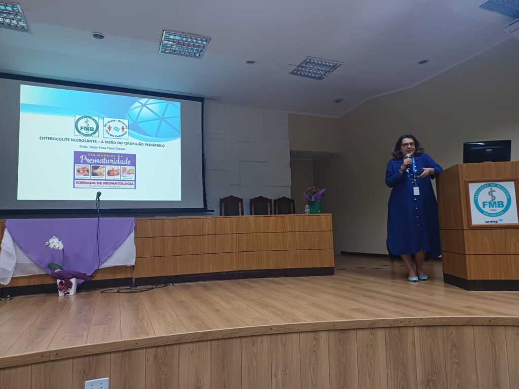 Posteriormente, houve mini-conferências com o tema “Enterocolite Necrosante”, coordenadas pelo Professor Associado e neonatologista João César Lyra, que mostraram esta doença a partir do olhar de uma neonatologia (a médica Érica C. Scarpa) e de uma cirurgiã pediátrica (a Professora Titular Erika Veruska Paiva Ortolan).