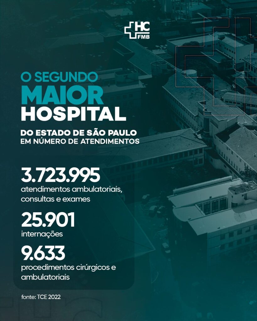 Entre janeiro e dezembro de 2022, o Hospital das Clínicas da Faculdade de Medicina de Botucatu (HCFMB) realizou 3.723.995 (três milhões setecentos e vinte e três mil novecentos e noventa e cinco) atendimentos, entre ambulatoriais, urgência, emergência, consultas e exames, ficando em segundo lugar em relação aos hospitais universitários do Estado de São Paulo com maior número de atendimentos.