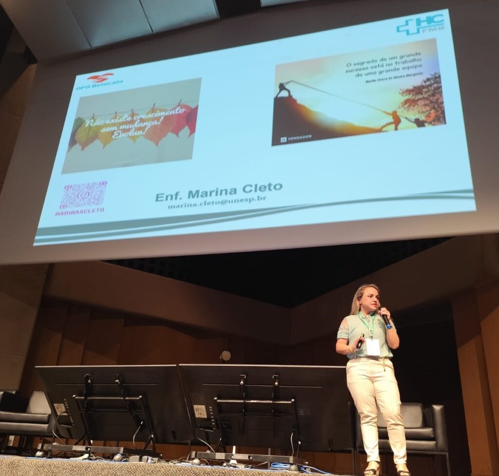 Marina Acosta Cleto, enfermeira responsável pela Organização de Procura de Órgãos (OPO) de Botucatu, foi uma das responsáveis por ministrar um dos conteúdos do evento cujo tema foi “Contribuições de uma CIHDOTT atuante para o processo de doação junto a OPO”.