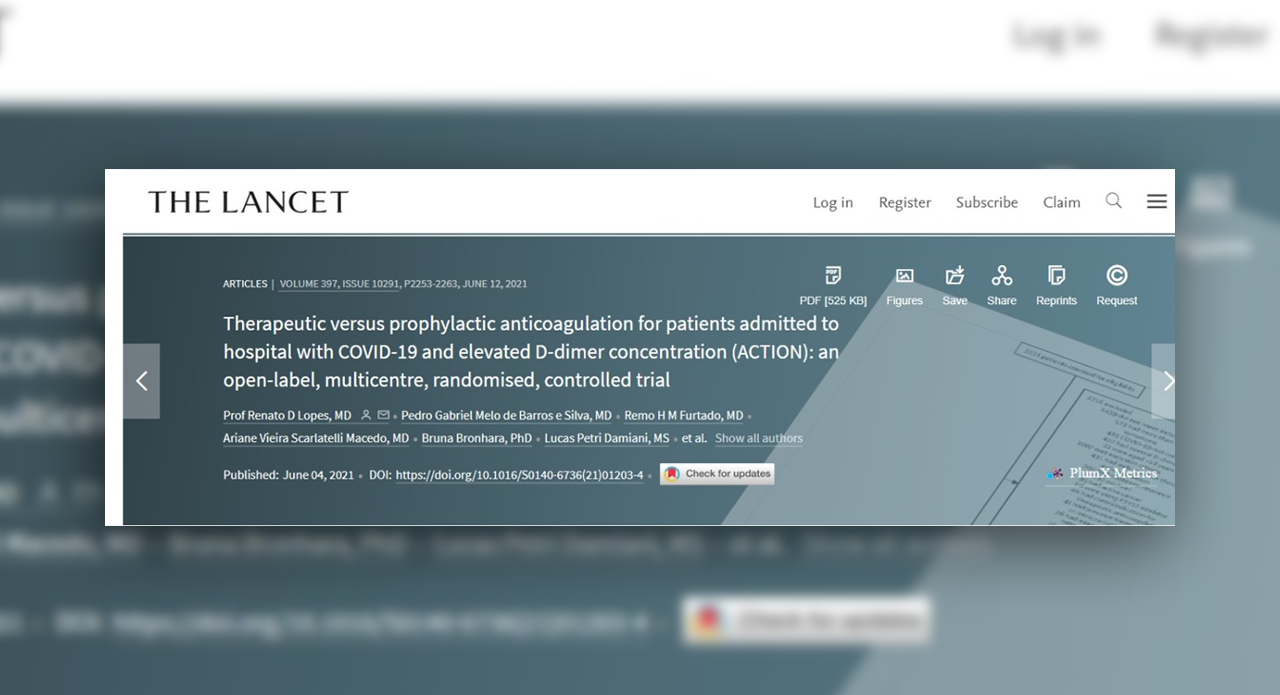 Denominado Therapeutic versus prophylactic anticoagulation for patients admitted to hospital with COVID-19 and elevated D-dimer concentration (ACTION): an open-label, multicentre, randomised, controlled trial -Anticoagulação terapêutica versus profilática para pacientes internados no hospital com COVID-19 e concentração elevada de dímero D (ACTION): um ensaio clínico aberto, multicêntrico, randomizado e controlado, o estudo 100% brasileiro foi realizado entre os meses de junho de 2020 e fevereiro de 2021 com mais de 600 pacientes incluídos em 31 hospitais do País.