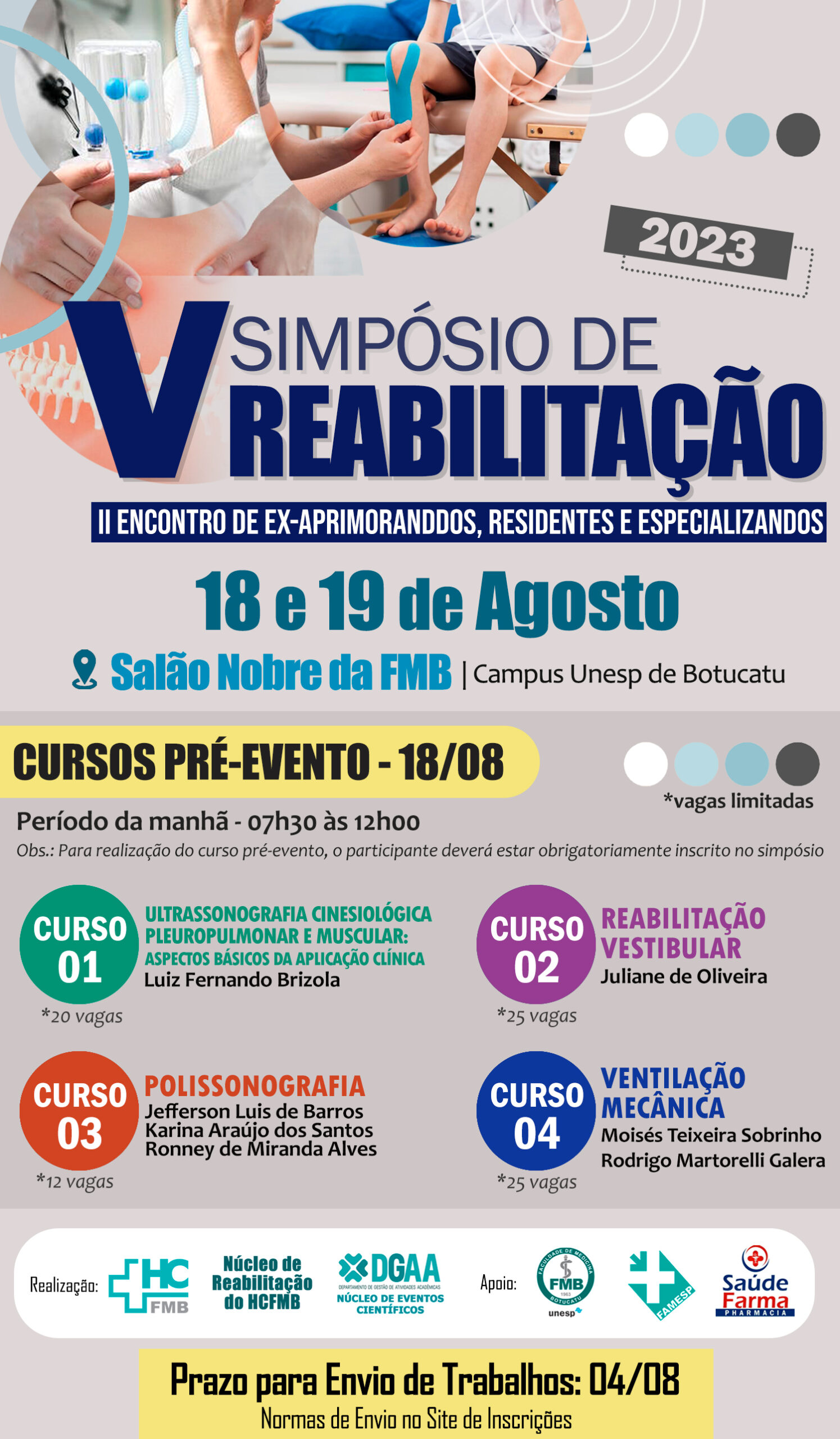Nos dias 18 e 19 de agosto, o Hospital das Clínicas da Faculdade de Medicina de Botucatu (HCFMB) promove o V Simpósio de Reabilitação do HCFMB e II Encontro de Ex-Aprimorandos, Residentes e Especializandos, organizado pelo Núcleo de Reabilitação e pelo Núcleo de Eventos Científicos do Departamento de Gestão de Atividades Acadêmicas (DGAA). As atividades serão realizadas no Salão Nobre da FMB.