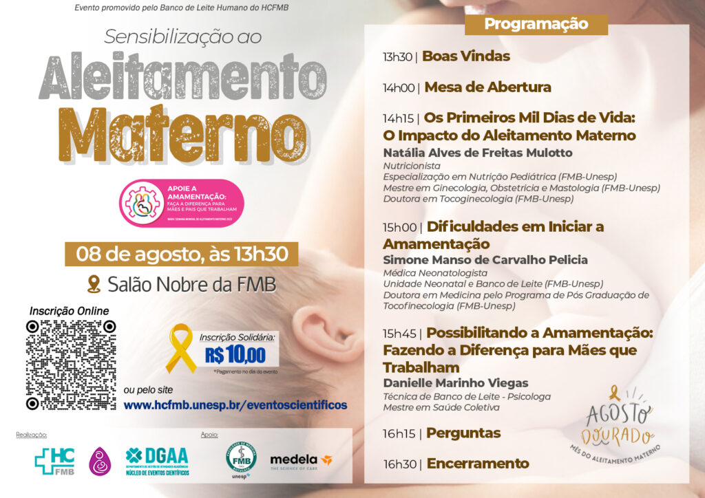 Com o propósito de incentivar o aleitamento materno, o Hospital das Clínicas da Faculdade de Medicina de Botucatu (HCFMB) promove o evento Sensibilização ao Aleitamento Materno, que será realizado no dia 8 de agosto, a partir das 13h30, no Salão Nobre da FMB.