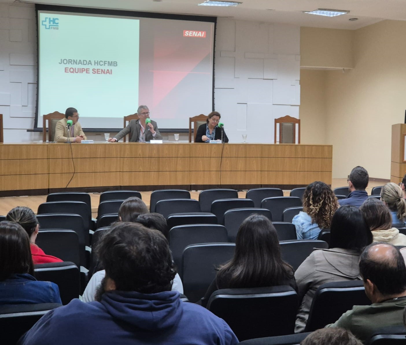 Participaram da mesa de abertura o Superintendente do HCFMB, José Carlos Souza Trindade Filho, o Diretor da Unidade do SENAI Botucatu, Tiago Guerreiro Ferreira, e a Gerente de Planejamento Estratégico do HCFMB, Patrícia Maria Moratelli Giuliani.