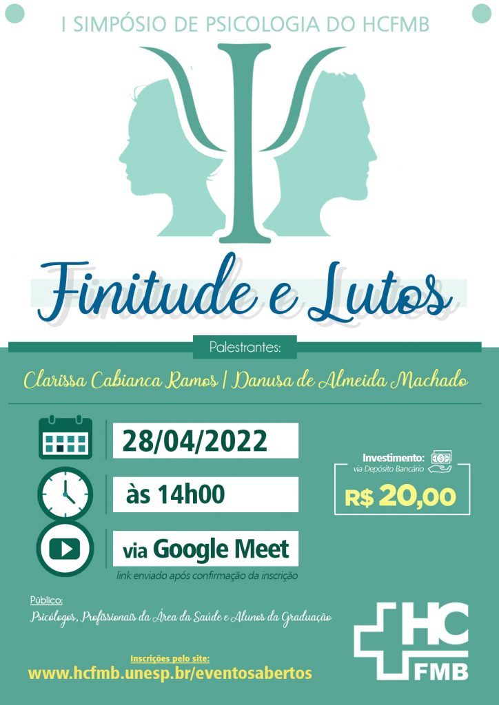 A Superintendência do HCFMB, por meio do Serviço de Psicologia Hospitalar e do Núcleo de Eventos Científicos do Departamento de Gestão de Atividades Acadêmicas (DGAA), convida para o I Simpósio de Psicologia do HCFMB: Finitude e Luto, que será realizado no dia 28 de abril, a partir das 14h, de forma online (via Google Meet – link de acesso será enviado após a confirmação da inscrição).