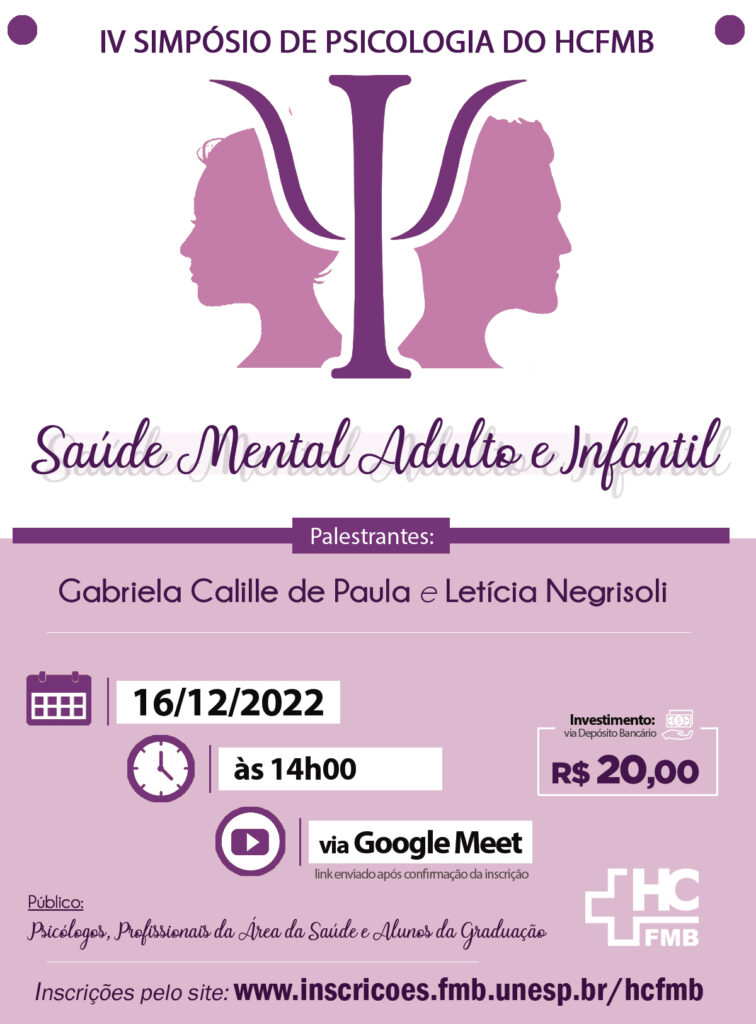 A Superintendência do HCFMB, por meio do Serviço de Psicologia e Terapia Ocupacional em Saúde Mental e do Núcleo de Eventos Científicos do Departamento de Gestão de Atividades Acadêmicas (DGAA), convida para o IV Simpósio de Psicologia do HCFMB: Saúde Mental Adulto e Infantil, que será realizado no dia 16 de dezembro, a partir das 14h, de forma online (via Google Meet – link de acesso será enviado após a confirmação da inscrição).