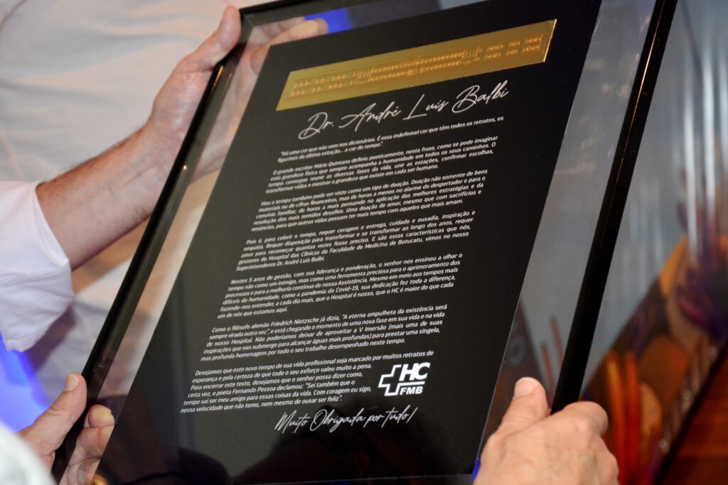 Ao final das atividades, o atual Superintendente do Hospital, Dr. André Balbi, foi surpreendido com uma placa celebrativa em homenagem aos anos de trabalho desempenhado à frente da Superintendência. “Todos vocês são pessoas admiráveis, com muitas qualidades e em quem coloquei a minha confiança durante este tempo. Pude aprender mais do que ensinar com todos e espero que o Hospital continue seguindo em frente, mesmo com todos os desafios, porque aqui é e sempre será a minha casa”, finalizou.