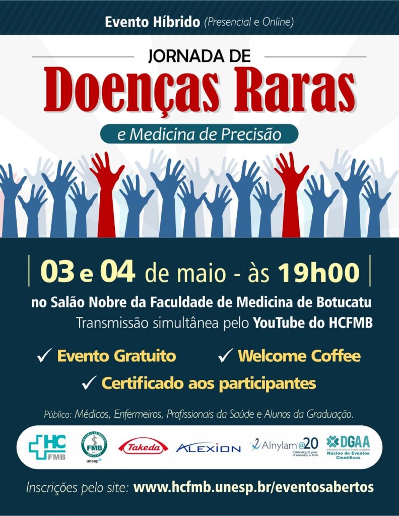 A Superintendência do HCFMB, por meio do Núcleo de Transplantes e do Núcleo de Eventos Científicos do Departamento de Gestão de Atividades Acadêmicas (DGAA), convida para a Jornada de Doenças Raras e Medicina de Precisão do HCFMB, que será realizado nos dias 3 e 4 de maio, a partir das 19h, de forma híbrida: presencialmente no Salão Nobre da FMB e online, com transmissão pelo canal do HCFMB no YouTube.