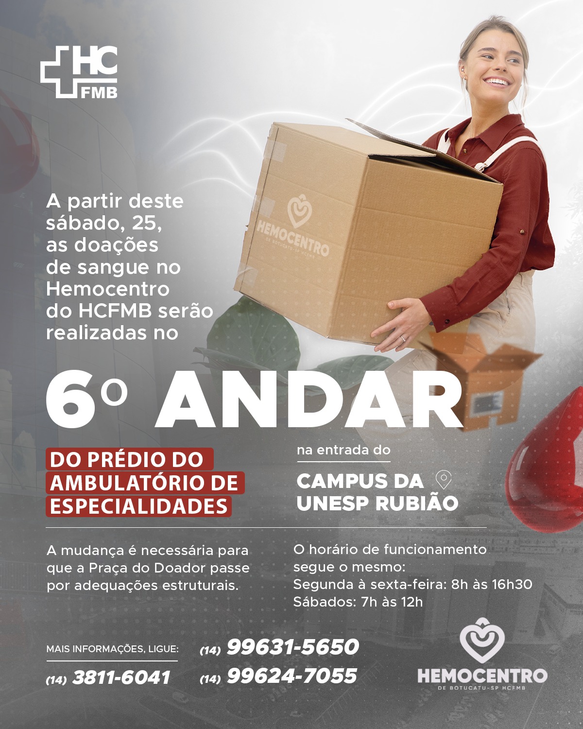 A partir do próximo sábado, 25, o setor de coleta de sangue do Hemocentro do Hospital das Clínicas da Faculdade de Medicina de Botucatu (HCFMB) estará atendendo temporariamente no 6º andar do Ambulatório de Especialidades, para adequações estruturais da Praça do Doador.