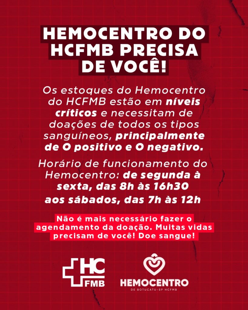 Os estoques do Hemocentro do Hospital das Clínicas da Faculdade de Medicina de Botucatu (HCFMB) estão em níveis críticos e necessitam de doações de todos os tipos sanguíneos, principalmente de O positivo e O negativo.