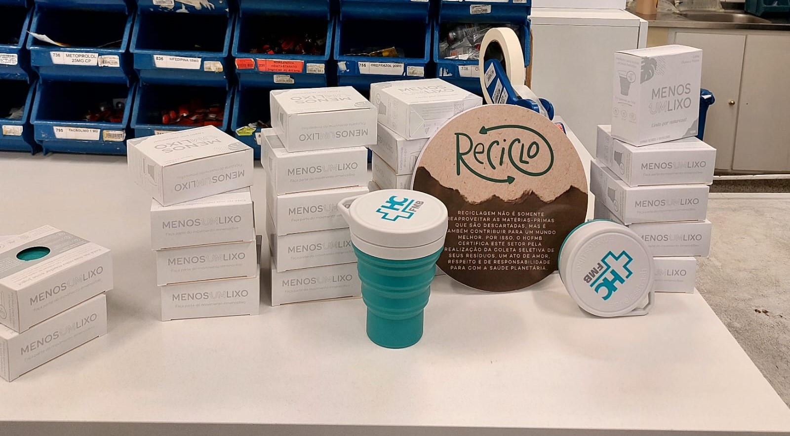 Com o Selo, os colaboradores da Farmácia e Hemocentro receberam um copo retrátil, reutilizável e fácil de transportar. “Esse copo é ideal para o uso no trabalho, reuniões, plantões e eventos, substitui o uso de centenas de copos descartáveis por ano. É uma ação que busca não só conscientizar sobre a reciclagem de materiais, mas a redução na geração de resíduos na Instituição”, pontua Karina.