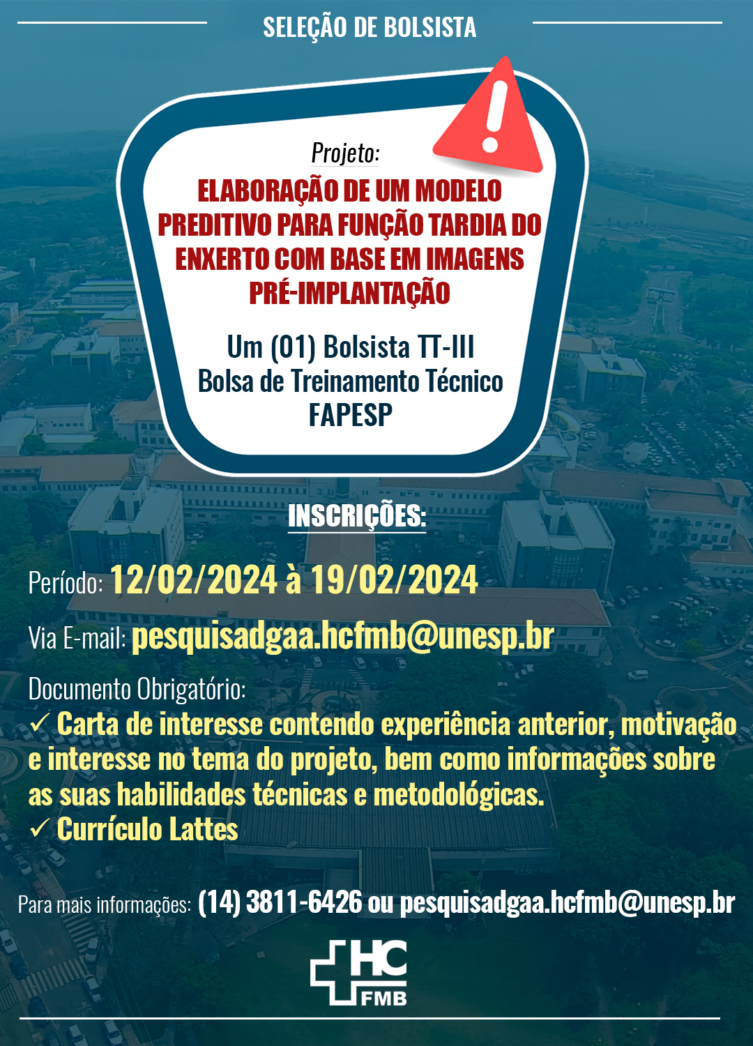 O Laboratório de Ciências de Dados e Análise Preditiva em Saúde (LabData) do Hospital das Clínicas da Faculdade de Medicina de Botucatu (HCFMB) torna pública a abertura de inscrições para seleção de um Bolsista TT-3 para Bolsa de Treinamento Técnico, vaga obtida a partir do projeto “Elaboração de um modelo preditivo para função tardia do enxerto com base em imagens pré-implantação”, aprovado pela Fundação de Amparo à Pesquisa do Estado de São Paulo (FAPESP).