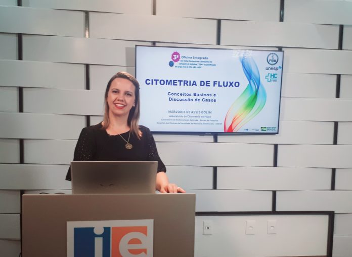 Biomédica do LBA, Márjorie de Assis Golim ministrou a palestra denominada “Conceitos Básicos de Citometria de Fluxo e discussão de casos”. O tema teve a finalidade de colaborar com a capacitação dos profissionais que compõem a rede nacional de laboratórios para realização de exames de diagnóstico e monitoramento de pacientes com HIV e hepatites virais.