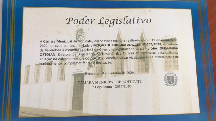 Quatro médicos do Hospital das Clínicas da Faculdade de Medicina de Botucatu (HCFMB) receberam uma moção de congratulações da Câmara Municipal de Botucatu, de autoria da vereadora Alessandra Lucchesi (PSDB), pelo reconhecimento e homenagem do CREMESP ao serviço prestado aos médicos brasileiros no enfrentamento da Covid-19.