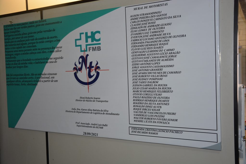 Para finalizar a cerimônia de entrega do novo espaço, foi realizado o descerramento de uma placa em homenagem a todos os motoristas que fizeram e fazem parte do Setor de Transportes do Hospital.