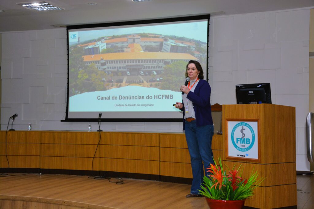 Após as explicações, a Diretora do Departamento de Logística de Atendimento do HCFMB e integrante da Unidade de Gestão da Integridade e Comissão de Ética e Conduta do HCFMB, Karen Aline Batista da Silva, mostrou os meios de comunicação que podem ser utilizados pelos servidores para denunciar casos de assédio.