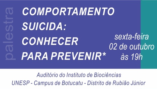 No próximo dia 02 de outubro, será ministrada a palestra Comportamento Suicida: conhecer para prevenir, a partir das 19h, no Auditório do Instituto de Biociências da UNESP – Campus de Botucatu.