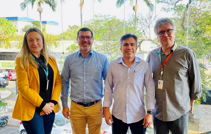 Da direita para a esquerda: Dr. José Carlos Souza Trindade Filho, Superintendente do HCFMB, Ricardo Miranda de Almeida, Coordenador de Atividades Técnicas do SENAI Luiz Massa-Botucatu; Tiago Guerreiro Ferreira, Diretor do SENAI Luiz Massa-Botucatu e Juliana Machado Rugolo, Diretora do Departamento de Atividades Acadêmicas e Coordenadora do Núcleo de Avaliação de Tecnologias em Saúde do HCFMB.