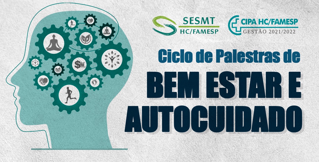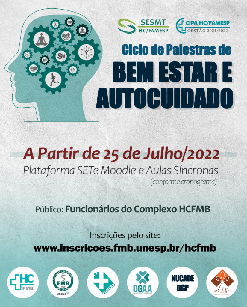 A Superintendência do HCFMB, através do Serviço Especializado em Engenharia de Segurança e Medicina do Trabalho (SESMT); do Núcleo de Eventos Científicos do Departamento de Gestão de Atividades Acadêmicas (DGAA); do Núcleo de Capacitação e Desenvolvimento de Pessoal (NUCADE) do Departamento de Gestão de Pessoas do HCFMB; da Faculdade de Medicina de Botucatu (FMB/Unesp) e das Comissões Internas de Prevenção de Acidentes (CIPAs) do HC e da Famesp, convida a todos os servidores do Complexo HC para participarem do Circuito de Palestras de Bem-Estar e Autocuidado, que se inicia no próximo dia 25 de julho.