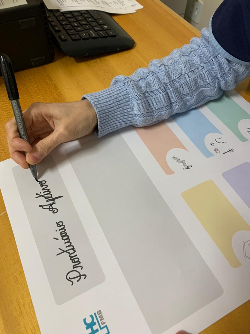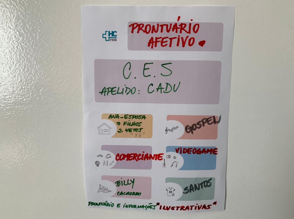 A equipe de enfermagem da UTI COVID do HCFMB, com total apoio e adesão das demais equipes multiprofissionais que atuam na linha de frente no tratamento dos casos de COVID-19 da unidade, tem implantado uma forma de reforçar o vínculo entre o paciente e a equipe que cuida dele neste momento tão delicado: dentro do leito, além das outras informações gerais, como nome, idade e cidade onde mora, é fixado o prontuário afetivo: escrito a mão de forma colorida e lúdica, a equipe colhe informações repassadas pela família, como apelidos, nomes dos filhos e netos, animais de estimação, time que torce e até as músicas preferidas.
