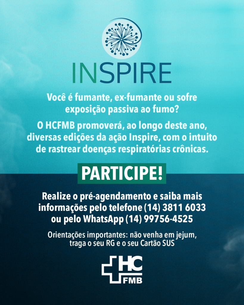 No próximo sábado, 8, haverá mais uma edição do Programa Inspire, para rastrear doenças respiratórias crônicas em fumantes, ex-fumantes e em indivíduos que sofrem exposição passiva ao fumo. A ação será realizada das 7h às 16h, na Função Pulmonar do HCFMB.