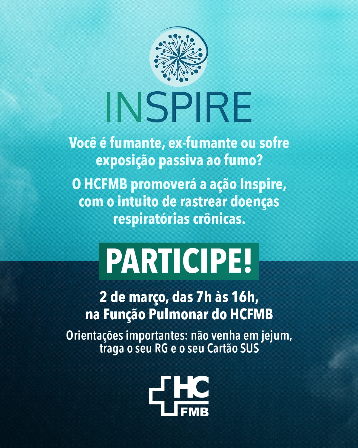 A próxima edição do Programa Inspire está agendada para o dia 2 de março, das 7h às 16h, na Função Pulmonar do HCFMB. As vagas são limitadas e há a necessidade do pré-agendamento pelo telefone (14) 3811-6033 ou pelo WhatsApp (14) 99756-4525. É necessário não vir em jejum e trazer o RG e o Cartão SUS.