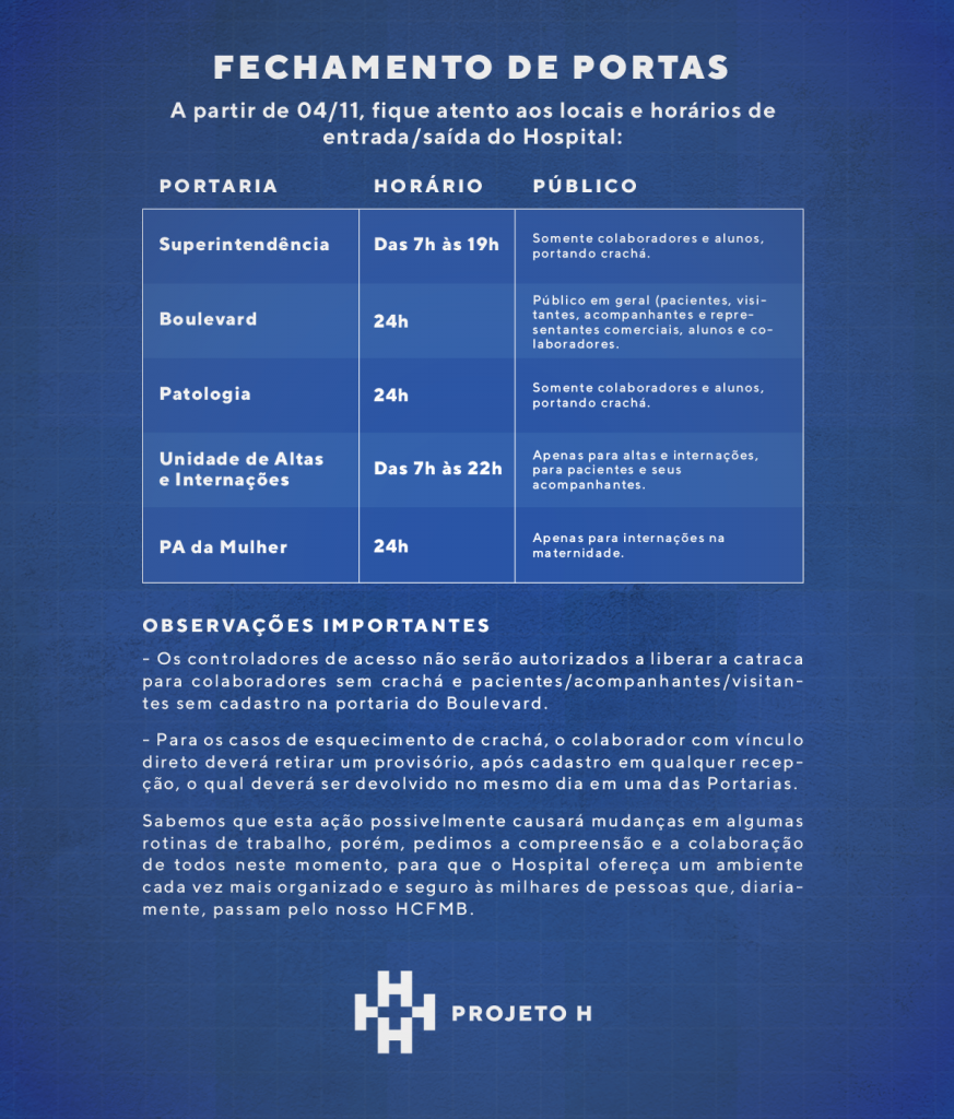 A partir de 4 de novembro de 2019, colaboradores, pacientes, visitantes e acompanhantes terão acesso interno controlado ao HCFMB, conforme a tabela anexa.