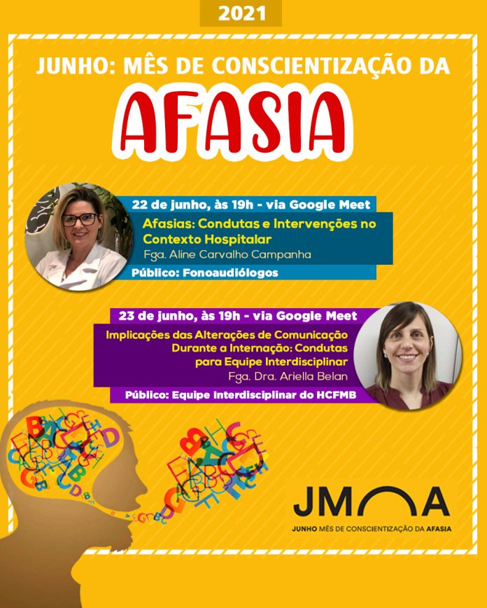 O primeiro será no dia 22 de junho, às 19h, com a palestra “Condutas e intervenções na afasia no contexto hospitalar”, direcionada para os fonoaudiólogos do HC e região e conduzida pela fonoaudióloga Dr.ª Aline Campanha. Já no dia seguinte, também às 19h, haverá uma atividade direcionada para a equipe multidisciplinar sobre “Implicações das alterações de comunicação durante a internação: condutas da equipe multidisciplinar”, ministrada pela fonoaudióloga Dr.ª Ariella Belan. Os interessados podem obter mais informações e se inscrever pelo link http://bit.ly/AfasiaHCFMB.