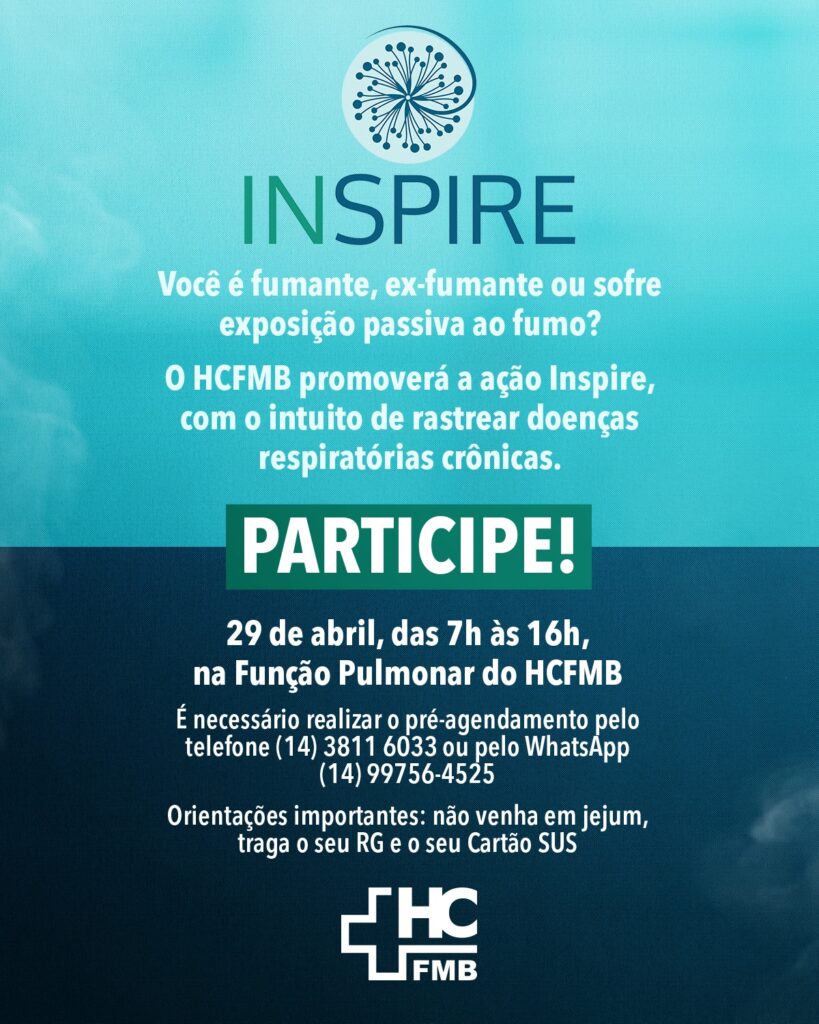 No próximo dia 29 de abril, o Hospital das Clínicas da Faculdade de Medicina de Botucatu (HCFMB) promoverá a segunda edição da ação Inspire, com o intuito de rastrear doenças respiratórias crônicas em fumantes, ex-fumantes e pessoas que sofrem exposição passiva ao fumo.