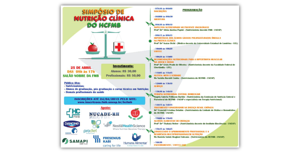 Será realizado neste sábado (25) o Primeiro Simpósio de Nutrição Clínica do Hospital das Clínicas da Faculdade de Medicina de Botucatu (HCFMB) promovido pelo Núcleo de Capacitação e Desenvolvimento de Recursos Humanos (NUCADE – RH). O simpósio é voltado para profissionais da área da saúde, em especial, da área da nutrição.