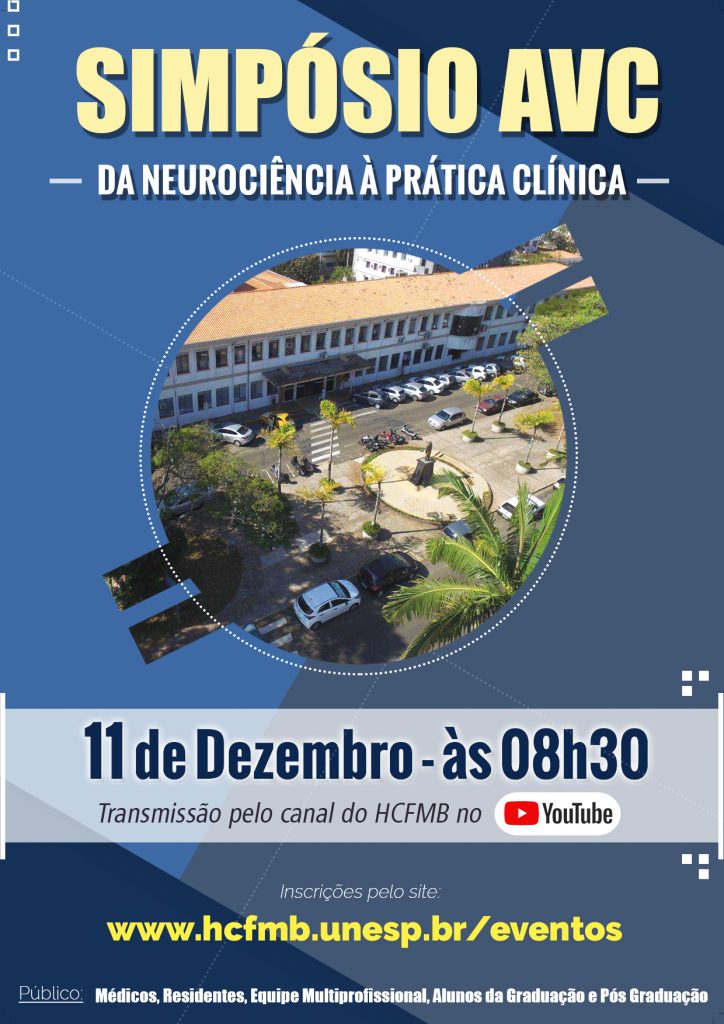 A Superintendência do HCFMB, através do Núcleo de Eventos Científicos do Departamento de Gestão de Atividades Acadêmicas (DGAA), da Unidade de AVC e da Liga de Neurociências da Faculdade de Medicina de Botucatu (FMB), convida para participar do Simpósio AVC: da Neurociência à Prática Clínica, que será realizado, de forma online, no dia 11 de dezembro, a partir das 8h30, com transmissão pelo canal do HCFMB no YouTube.
