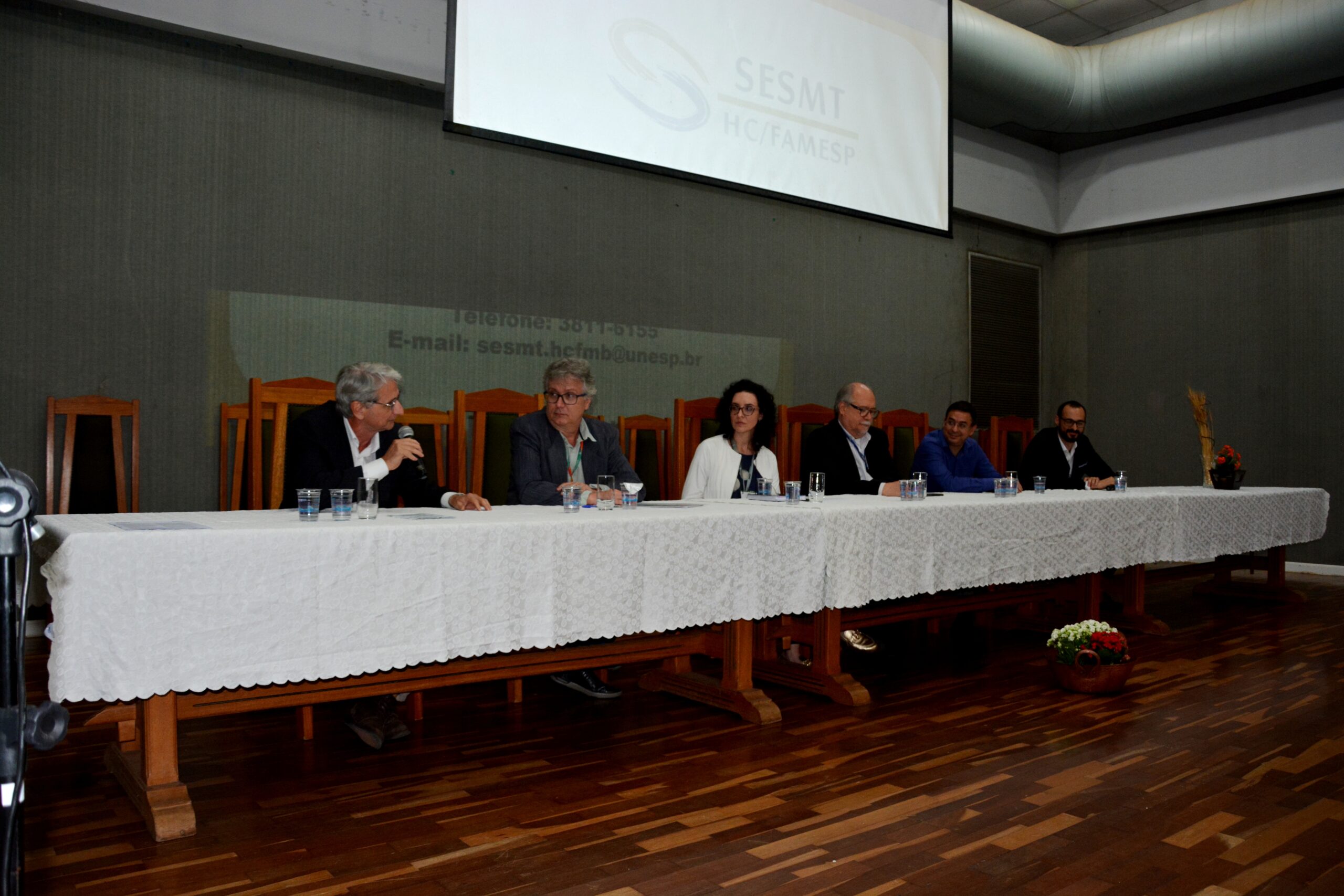 Compondo a mesa de abertura, estiveram presentes o Vice-Diretor da FMVZ, Prof. Titular Mário De Beni Arrigoni; o Superintendente do HCFMB, Dr. José Carlos Souza Trindade Filho; o Vice-Presidente da Famesp, Dr. Trajano Sardemberg; o Diretor da FMB | Unesp, Dr. Carlos Magno Castelo Branco Fortaleza (representando o Grupo Administrativo do Campus), e a coordenadora do SESMT HCFMB / Famesp, Enf.ª Dra Camila Polo Camargo da Silva, além do Prof. Dr. Allan Felipe Fattori Alves, representando o IBB | Unesp.