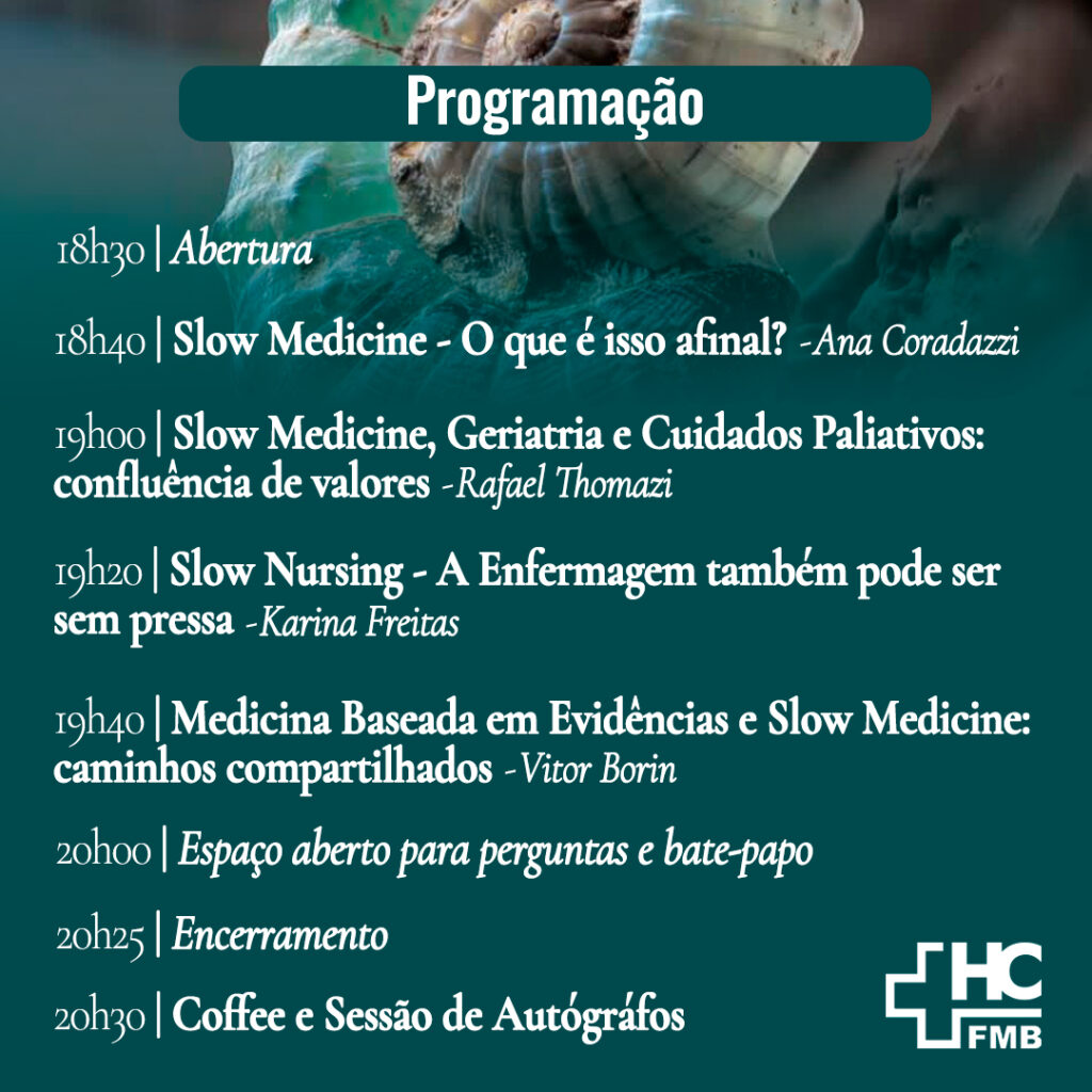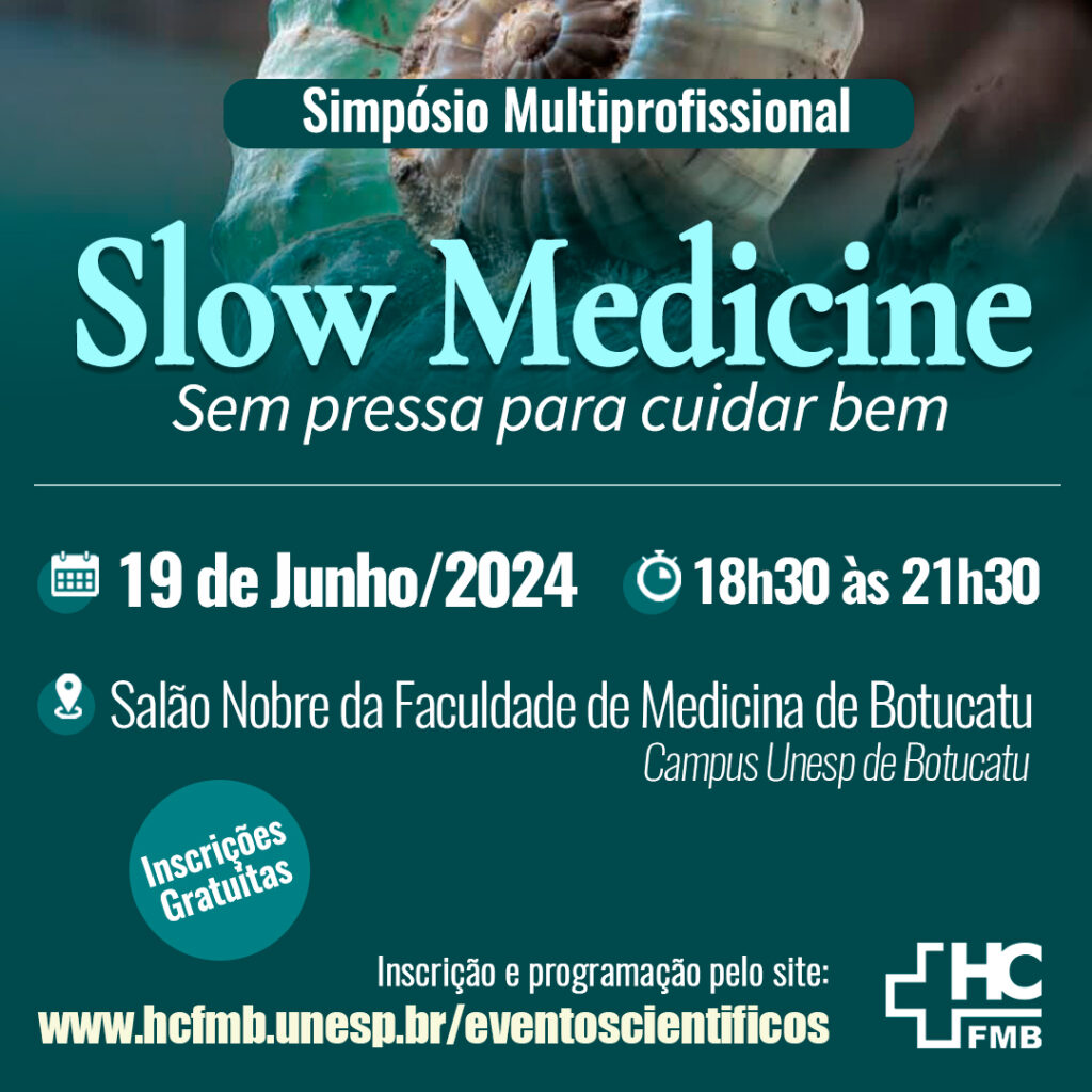 A Superintendência do HCFMB, através do Hospital Estadual Botucatu, do Serviço de Oncologia Clínica e do Núcleo de Eventos Científicos do Departamento de Gestão de Atividades Acadêmicas (DGAA), convidam para o evento Slow Medicine – sem pressa para cuidar bem, que será realizado no dia 19 de junho, das 18h30 às 21h30, no Salão Nobre da FMB.