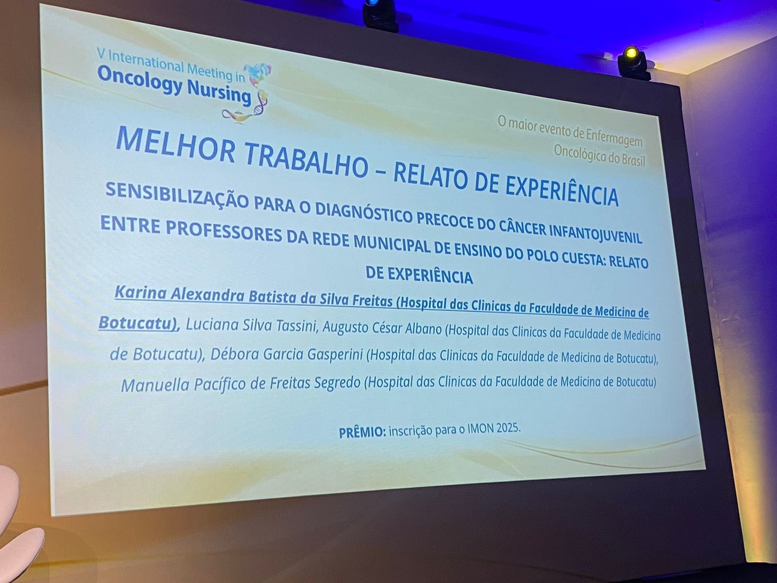 O projeto premiado foi um relato de experiência sobre a sensibilização em câncer infantojuvenil conduzida com professores das redes municipais de ensino de cinco cidades do Polo Cuesta. O objetivo foi relatar a experiência sobre a sensibilização dos professores das redes municipais de educação infantil e ensino fundamental sobre a importância do diagnóstico precoce do câncer infantojuvenil.