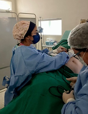 As médicas do HCFMB durante procedimento de transfusão fetal intrauterina – Drª Juliana Marques Simões Villas Boas e Drª Cláudia Magalhães