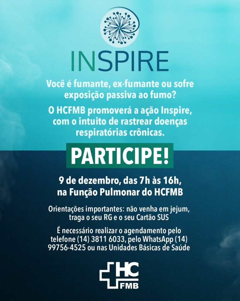No próximo dia 9 de dezembro, o Hospital das Clínicas da Faculdade de Medicina de Botucatu (HCFMB) promoverá a última edição de 2023 da ação Inspire, com o intuito de rastrear doenças respiratórias crônicas em fumantes, ex-fumantes, pessoas que sofrem exposição passiva ao fumo ou que apresentem sintomas respiratórios mesmo sem histórico de tabagismo.