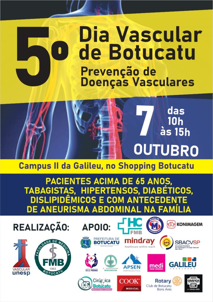 No próximo dia 07 de outubro, a disciplina de Cirurgia Vascular da Faculdade de Medicina da Unesp de Botucatu (FMB), em parceria com a Secretaria Municipal de Saúde de Botucatu, Faculdade Galileu; com a apoio da Sociedade Brasileira de Angiologia e Cirurgia Vascular – Regional São Paulo (SBACV-SP) e Rotary Clube Bons Ares, realizarão no Campus II da Faculdade Galileu (Shopping Botucatu) o 5º Dia Vascular de Botucatu.